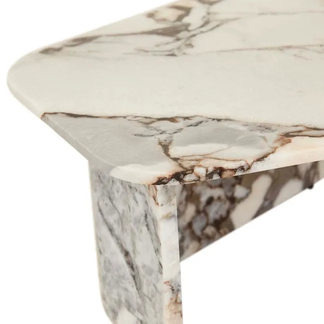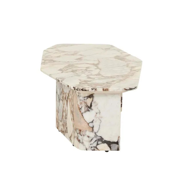 The Atlas Shift Coffee Table in Matt Ocean Marble embodies modern design with its angular and asymmetrical inspiration. Crafted for indoor use, it features a slim form and an irregular geometric shape softened by rounded edges. The marble top and legs, treated with a water based sealer, provide both elegance and durability. Its elongated shape allows for nesting with other tables or flexible use in various spaces. This table is perfect for adding a contemporary touch to your living area.