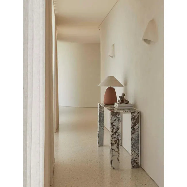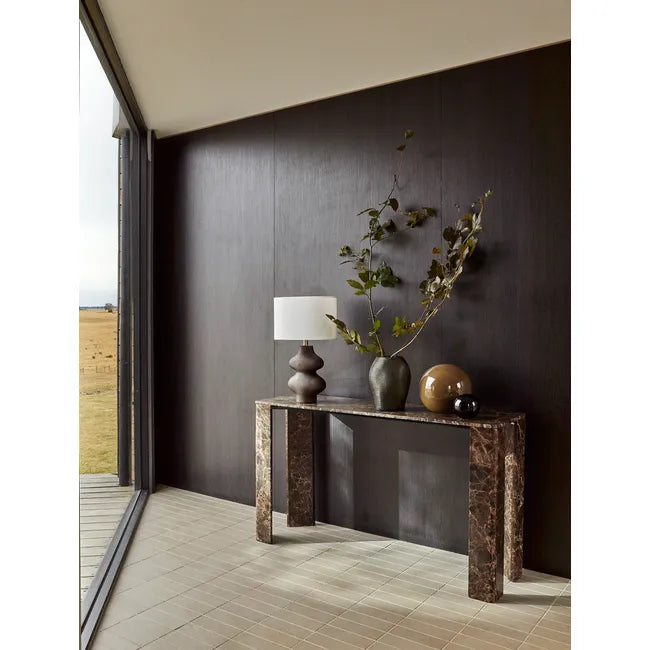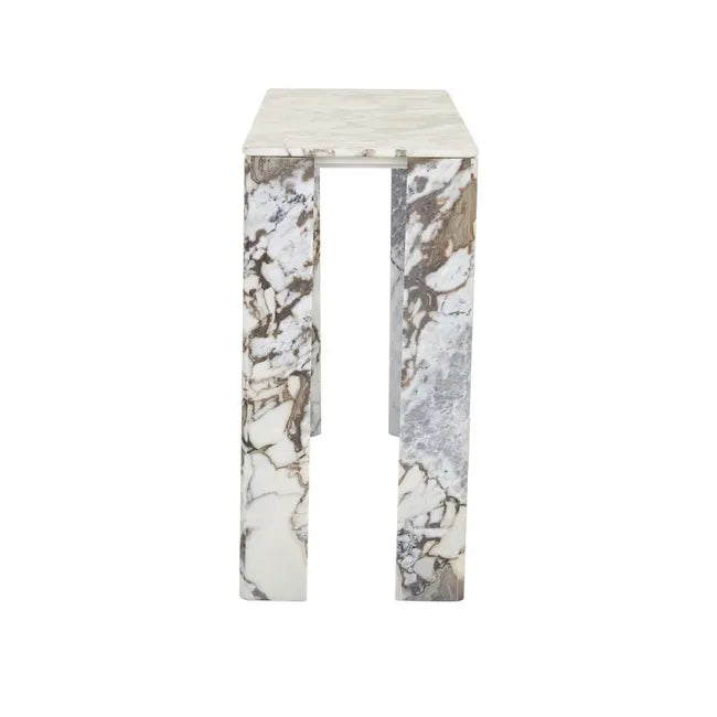 Versatile and sleek, the Atlas Slab Console Table is crafted in richly veined marble. Its solid form and slab legs lend it interest and contemporary style.
