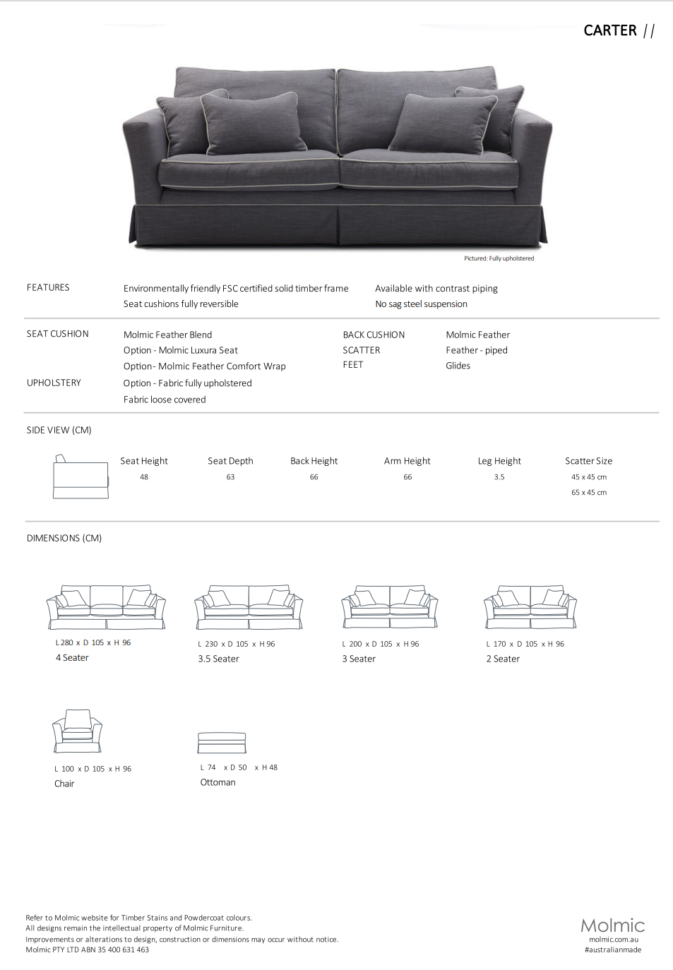 - BACK CUSHIONS: Molmic Feather Blend (fully reversible).