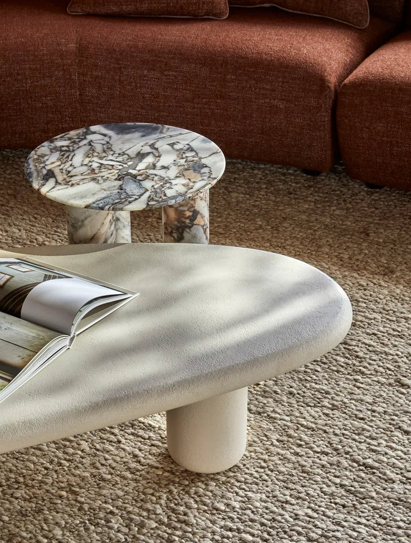 The Elba Coffee Table in Rope draws inspiration from the softly shaped pebbles and white sands of the Tuscan Elba coastline. Featuring an organic-shaped top, rounded pillar legs and a hand-applied mineral plaster finish in a soft Rope hue, this contemporary coffee table brings natural elegance and sculptural beauty to any indoor space.
