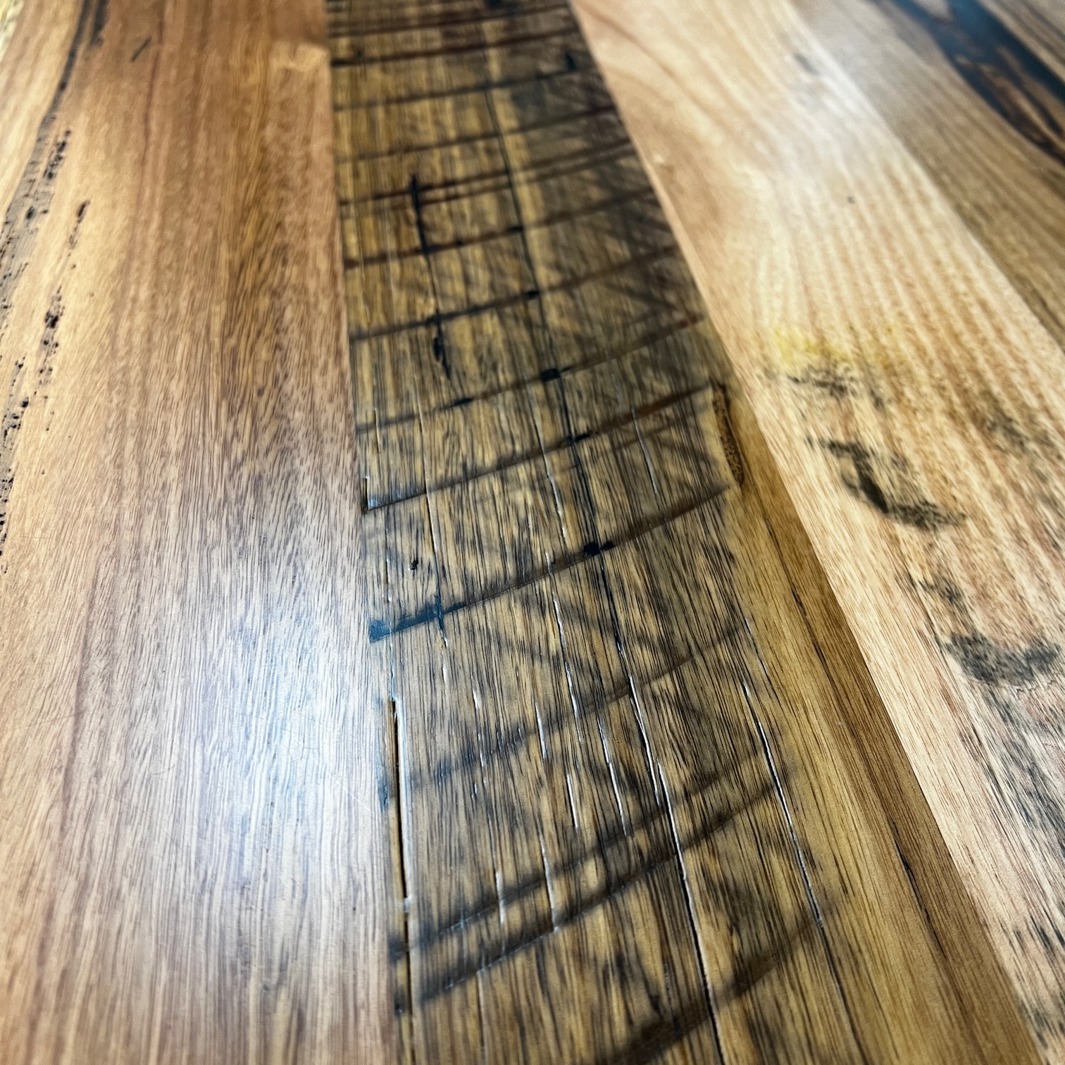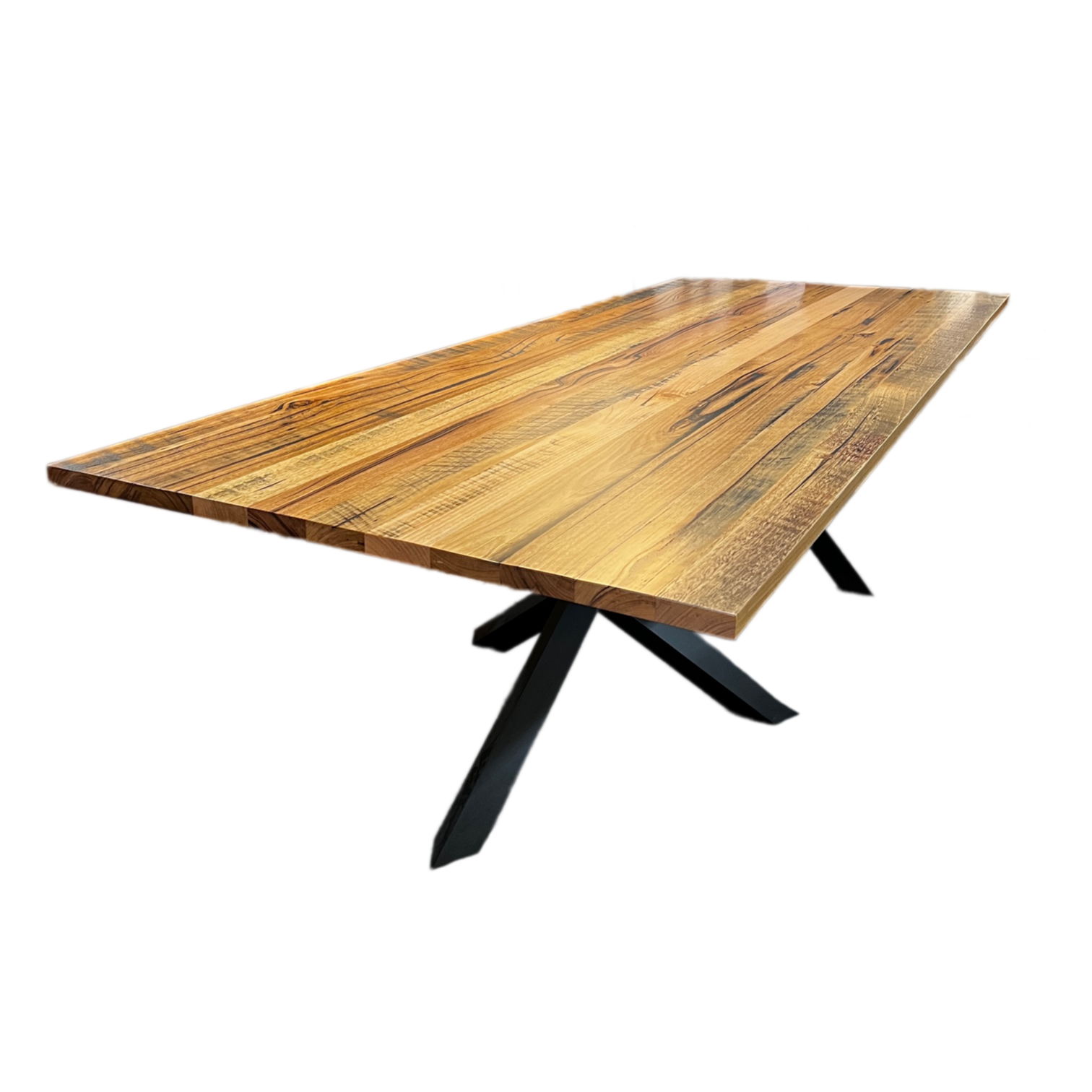 The stunning design with its striking architectural lines certainly commands attention. The Newbridge Dining Table pictured has been handcrafted using Rough Sawn Messmate timber. The beautiful rough sawn finish highlights the natural knots, veins, and characteristics of the timber, producing a stunning effect. This on-trend contemporary design features Tasmanian Oak splayed black stained legs and a 30mm tabletop. This amazing dining table can be custom designed in various sizes and timbers.