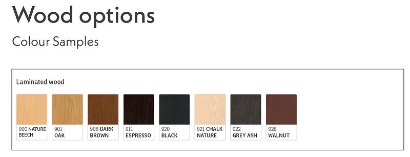 Our fabric, leather and wood finishes can be seen in the links below. Thank you.