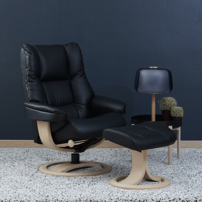 Chair and ottoman are available with two bases; a laminated wood ring base and classic wood star base in a selection of custom finishes. You also have a choice of leather and fabric upholstery.
