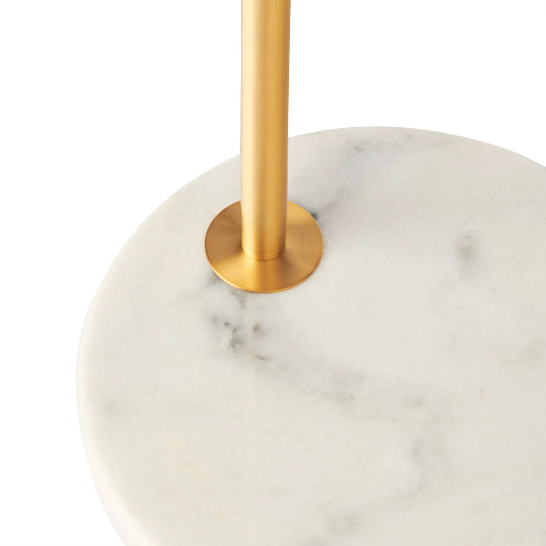 The Remi Floor Lamp comes in Antique Brass with a White Marble base and spherical Glass shade. A striking contemporary classic style.