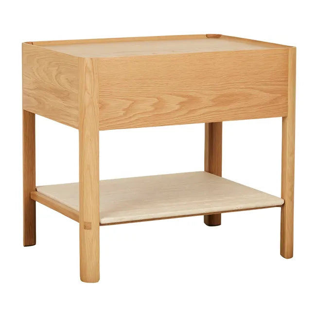 The bedroom is a place for rest, without need for distractions and ornaments. The rounded legs keeps your shins safe, and the scooped-out top provides a safe shelf for your bedroom essentials while offering a comfortable pull for the draw that stores your personal items. By choosing the marble shelf you add an element of surprise and contrast to your sacred space